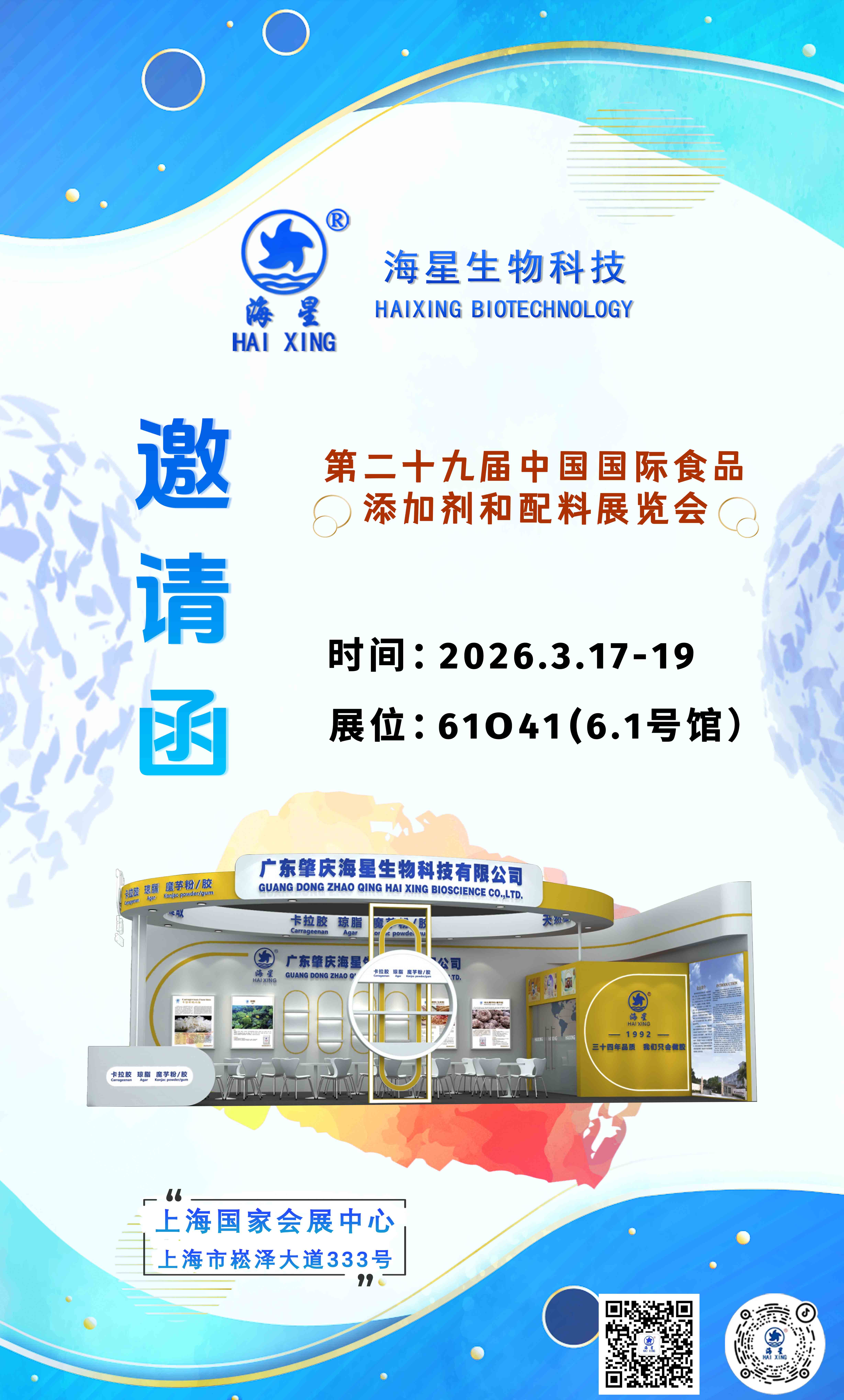 2026年第二十九届中国国际食品添加剂和配料展览会(FIC2026)将于3月17--19日在上海国家会展中心隆重举行,我司展位号:61O41(6.1号馆),海星诚挚地邀请您莅临我们的展位,我们衷心地期待着与您在展会相聚,一同探讨合作机会,共创美好未来 !